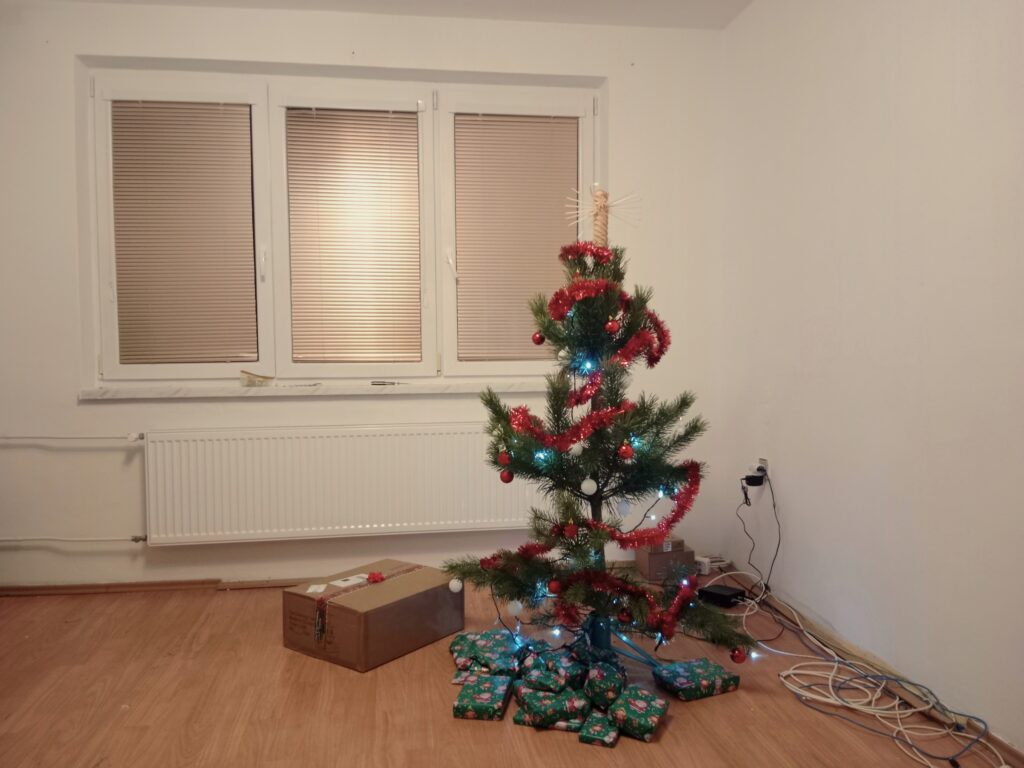 Při rozbalování dárků jsem si uvědomila, že takové vánoční zátiší jako my jen tak někdo nemá. Stromeček, který bychom si sami nevybrali, holé zdi, hromada kabelů, okna bez garnýží, a tedy i bez záclon.